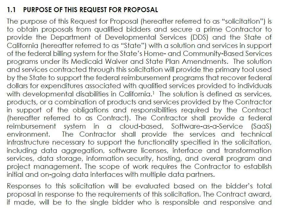 Buyer: CA Dpt of Developmental Services | Due date: July 15, 2020 | Scope summary: Billing and payment solution for Medicaid waiver | Minimum qualifications: tied to staff experience